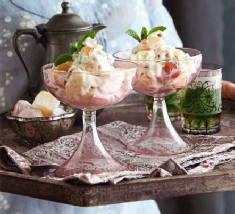 1. Place the mascarpone, yogurt, sugar and orange flower water into a large bowl and whisk until thickened. Fold the remaining ingredients through, then divide the mix between 2 dessert glasses or bowls and decorate with extra mint, if you like.