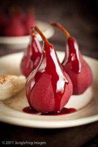 Take the pears out of the pan with a slotted spoon and put them in a bowl. Pour the wine into a saucepan and leave to cook on high heat for about 5 to 10 minutes to reduce down. Make the sauce thicker with a little cornstarch, diluted with a bit of water. Put the pears into the liquid and leave to cool