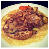 1. In a large bowl, mix the chicken pieces with the onions, olive oil, ginger,