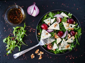 Roughly chop the walnuts, roquefort and finely chop the chives. Pick the lambs lettuce and endive into a large mixing bowl. Cut the end off the endive and put the leaves into the bowl also. Scatter over the chopped walnuts, roquefort and chives.