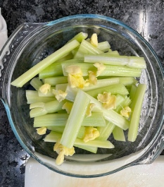 If you like Celery you will love this recipe. The celery is cooked in its own juice with a little butter in the oven until it is tender and starting to caramelize. As a variation, you can add fennel, prepare in the same way and add to the celery an hour before the end of cooking time (fennel cooks much quicker than celery), or just do it with fennel. This dish goes well with roast pork or lamb.